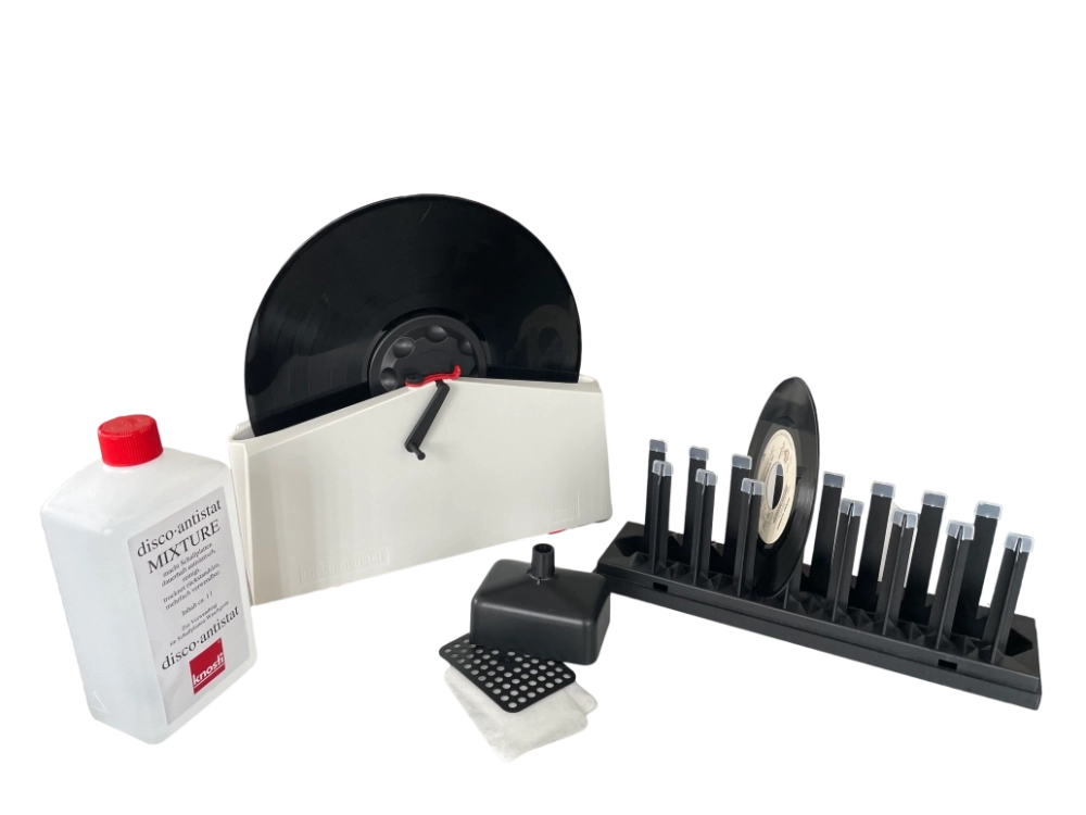 * Draining stand (drying stand) with drip tray for up to 15 LPs or singles (slides into the case after use)