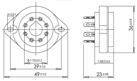 8 polige octal socket zoals o.a. gebruikt door Fender. Diameter bevestigingsgat = 1 inch (2,54 cm)